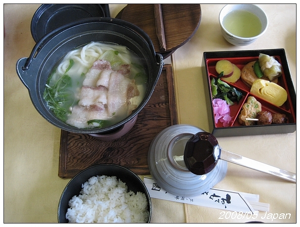 鍋中是烏龍麵和豬肉片,豆腐,菜..
